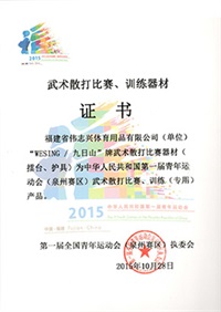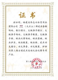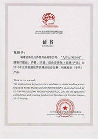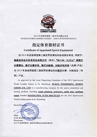 | 2013年圣彼得堡第二屆世界武搏運(yùn)動(dòng)會(huì)散打器材使用證書 | 2010年北京首屆世界武搏運(yùn)動(dòng)會(huì)比賽、訓(xùn)練專用品 |
