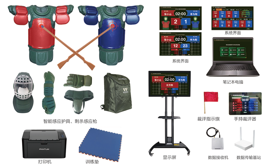 軟件系統(tǒng)、筆記本電腦、顯示屏、數(shù)據(jù)接收器與傳輸基站、手持裁評(píng)器、裁判指示旗、智能感應(yīng)護(hù)具、刺殺感應(yīng)槍、打印機(jī)、訓(xùn)練墊